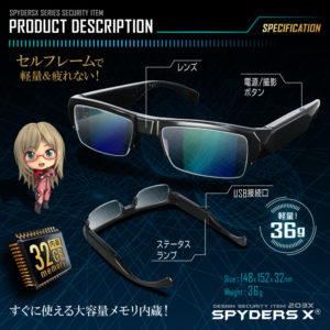 (E-280)メガネ型カメラ 小型カメラ スパイダーズX スパイカメラ 1080P ミラーコートレンズ 32GB内蔵